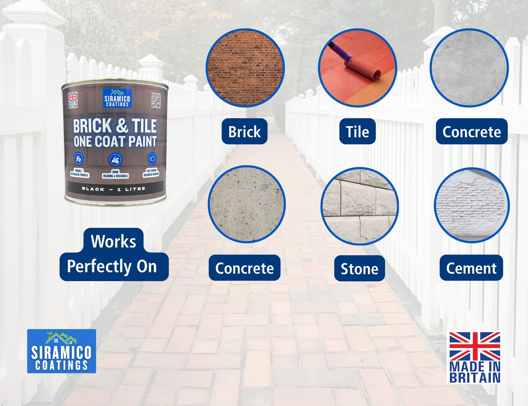 Siramico Coatings Brick & Tile Paint is a premium acrylic matt black paint, pigmented with micronised black oxide to deliver excellent opacity, durability, and a self-cleaning exterior finish. Suitable for both interior and exterior masonry surfaces.
